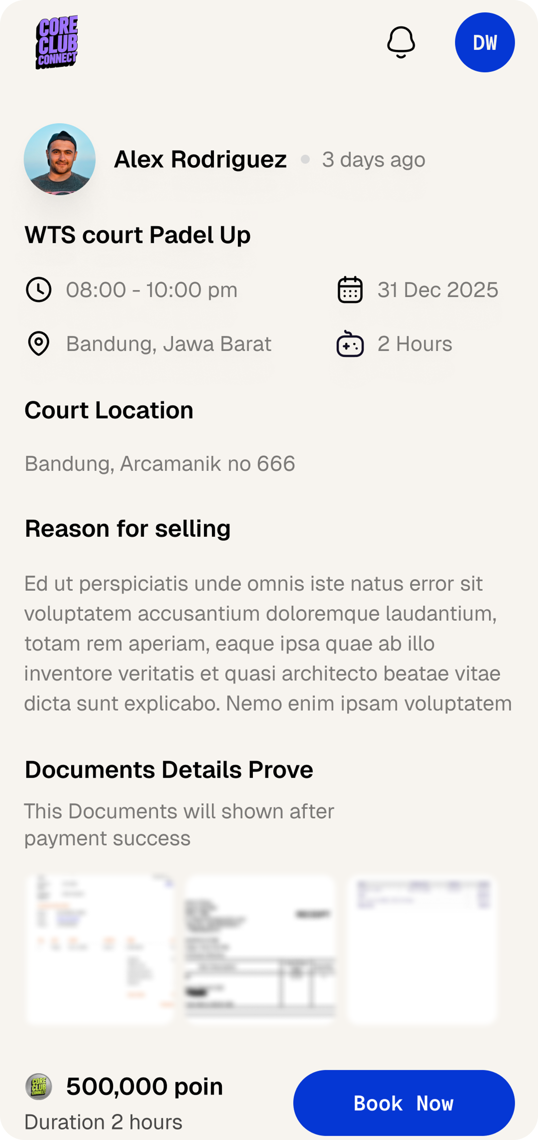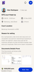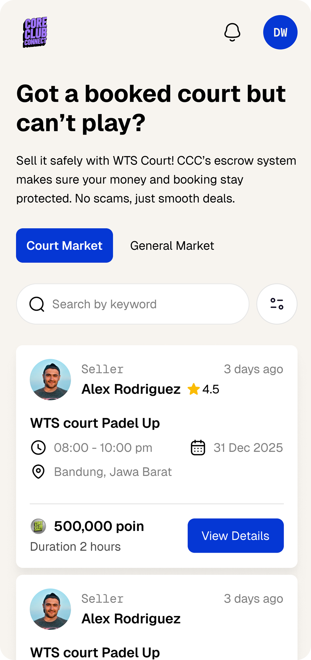 Tenang, lewat fitur Want to Sell, kamu bisa menjual kembali jadwal lapanganmu dengan mudah dan aman. Cukup isi data jadwal yang akan kamu jual di paltform CCC Market, input harga yang kamu inginkan, dan biarkan CCC mengamankan transaksi melalui escrow.
